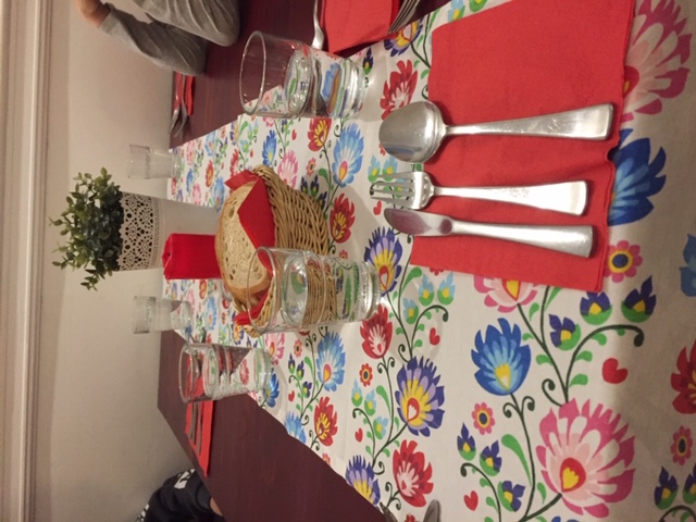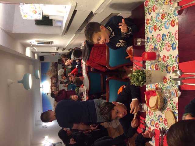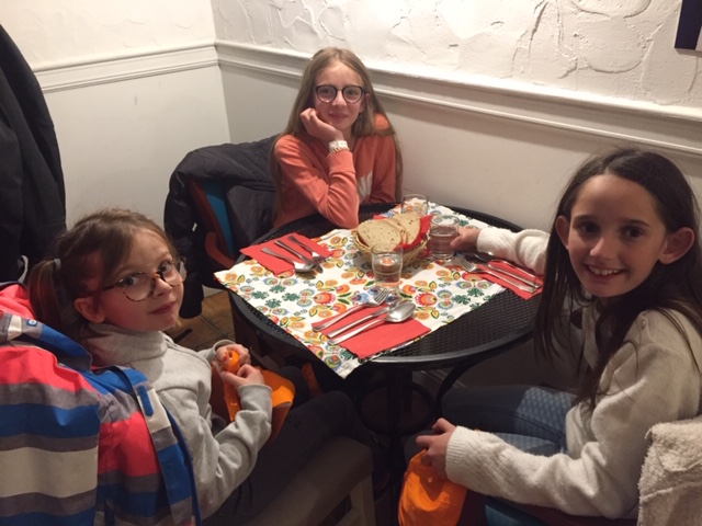 Au retour, les élèves restants avaient fait leur toilette et nous attendaient. Une petite douche pour les quinze aventuriers et direction le restaurant. Là bas, une belle salle avec de jolies tables bien décorées nous attendaient, et surtout M. le maire et son adjointe qui avaient enfin réussi à nous rejoindre malgré les retards et les annulations d'avions (poisson d'avril, même le maître et la maîtresse sont tombés dans le panneau).