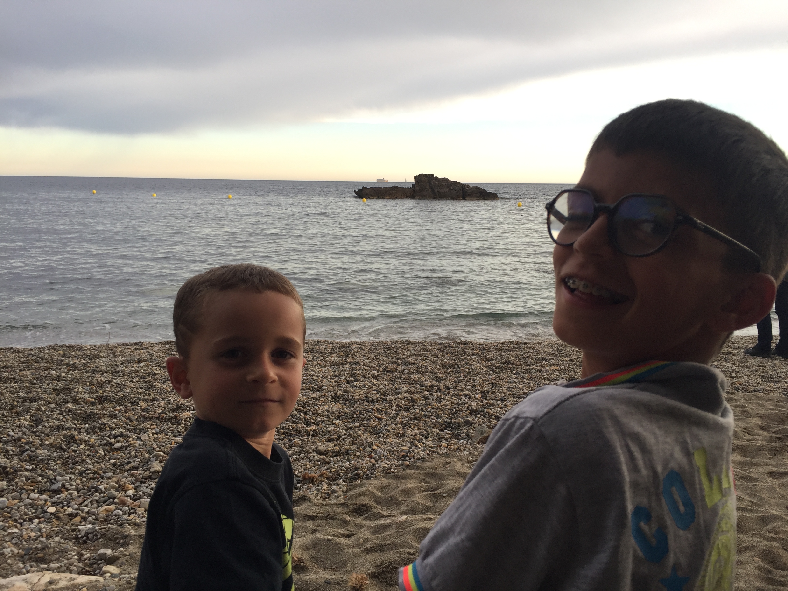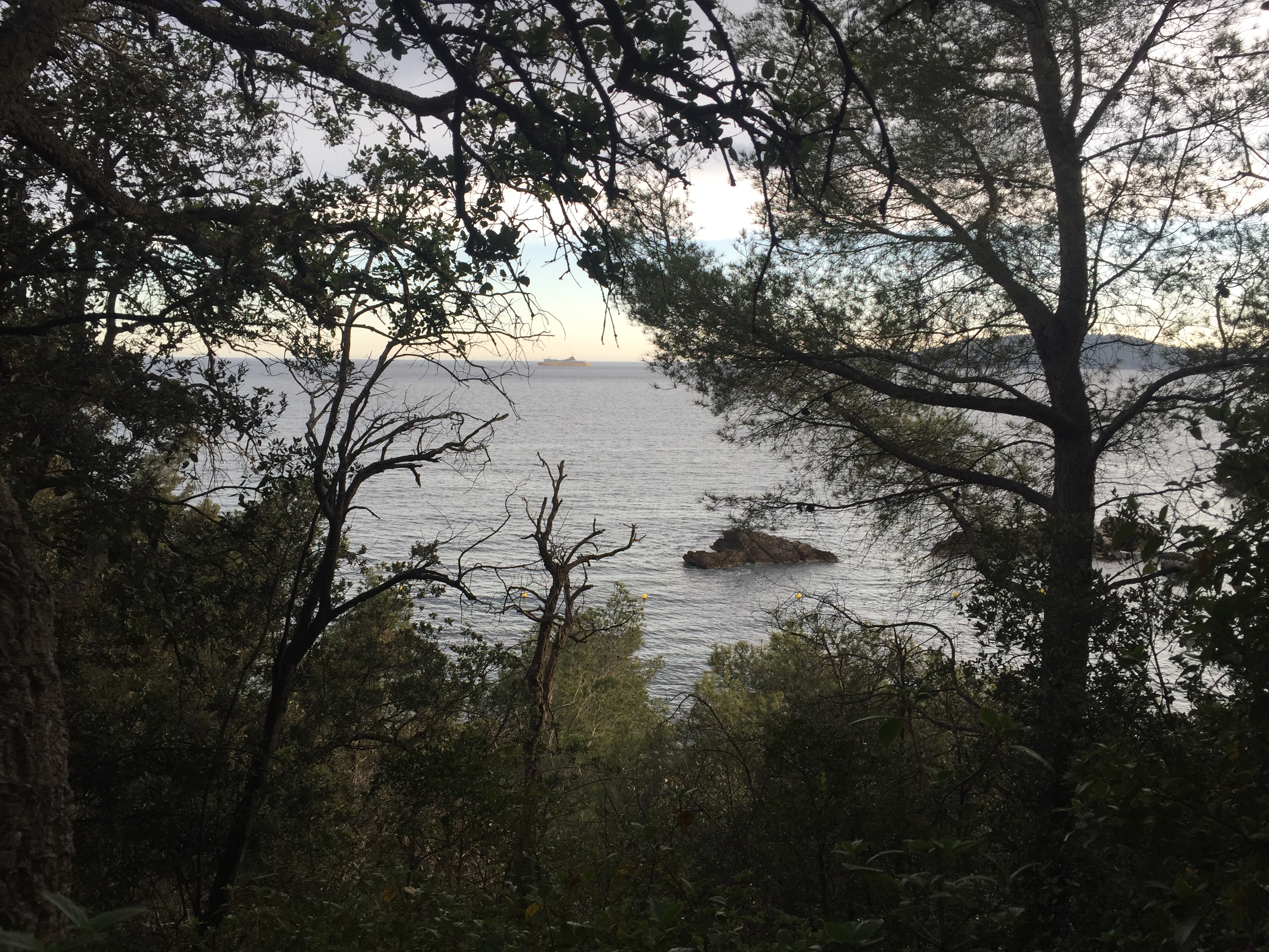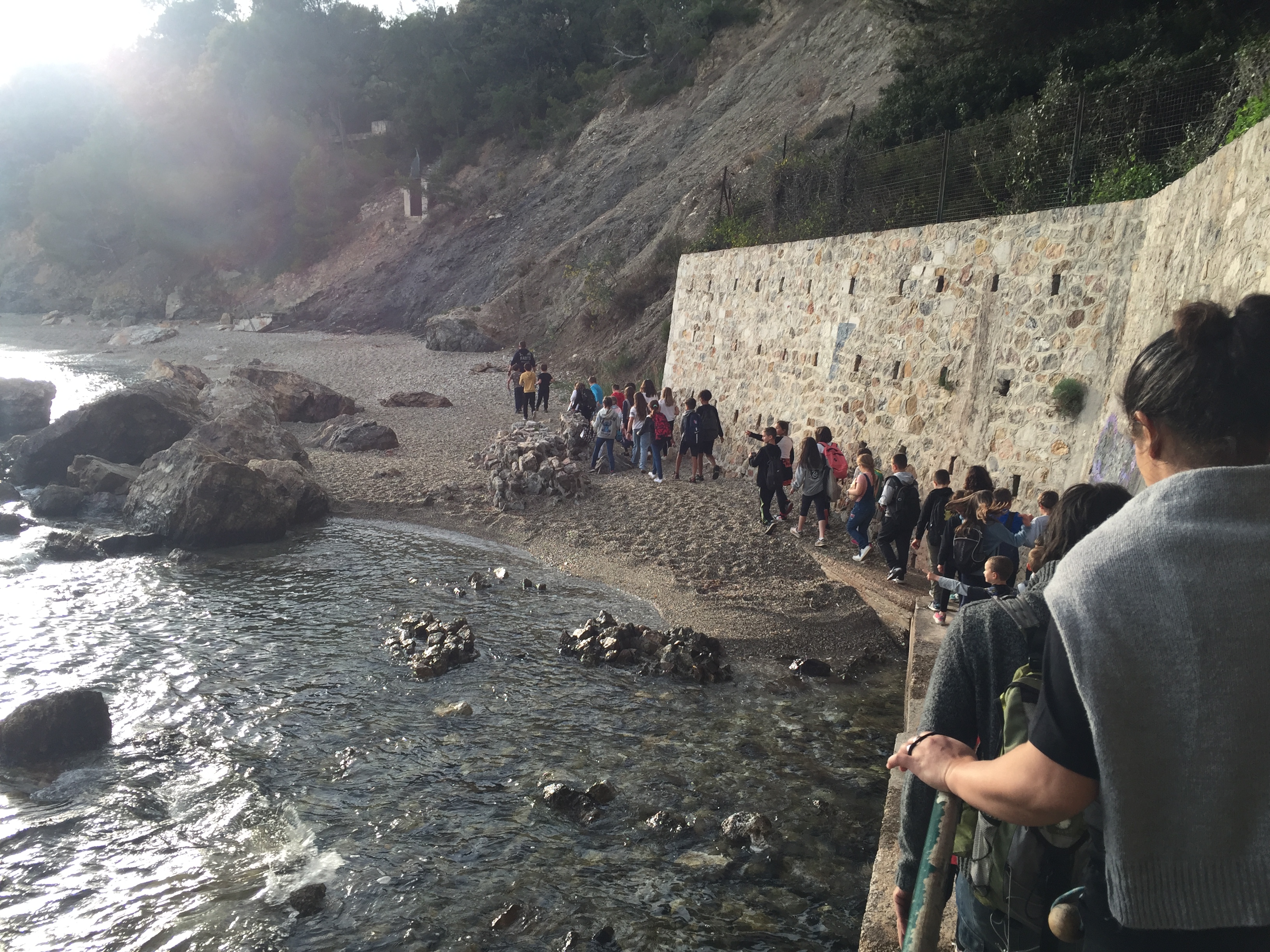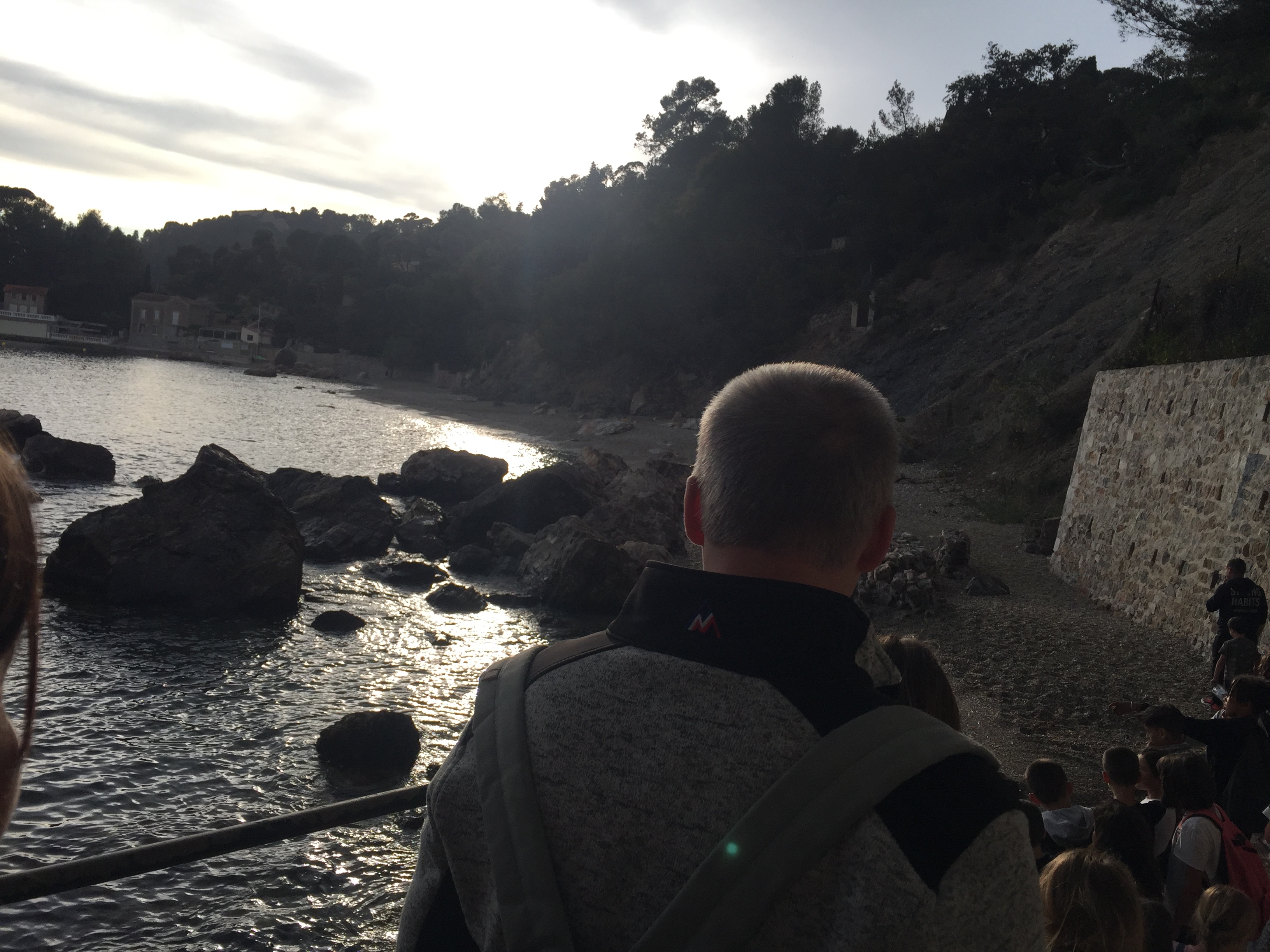 Nous avons ensuite traversé le parc du domaine, où se trouvent un filet de handball, mais surtout un joli petit brin de nature, avant de descendre jusqu'à la plage privée du domaine : « Vous avez trop bien choisi ! » « C'est magnifique ! » « Wouaaah ! » « La mer ! Regardez, il y a un énorme navire ! »