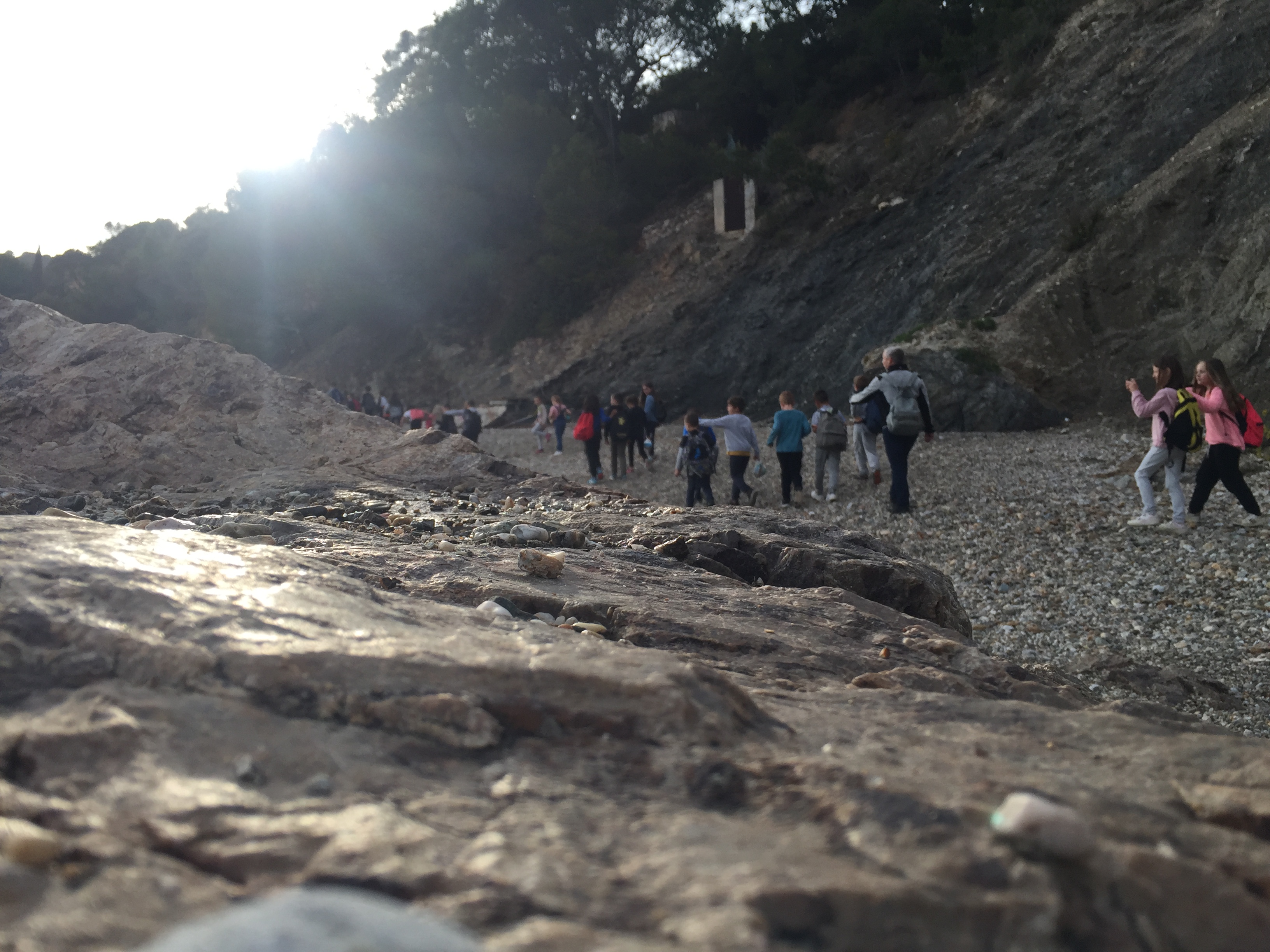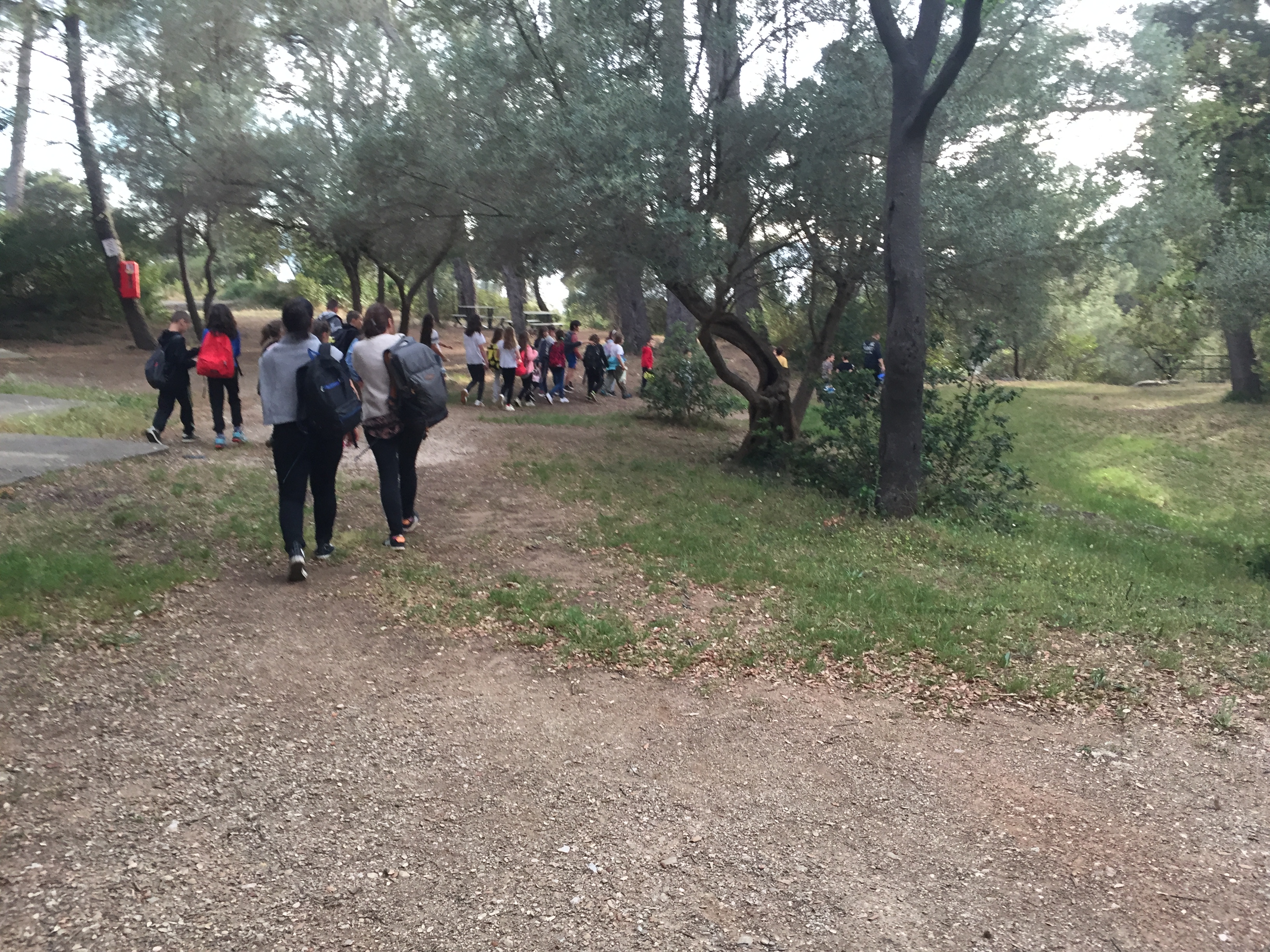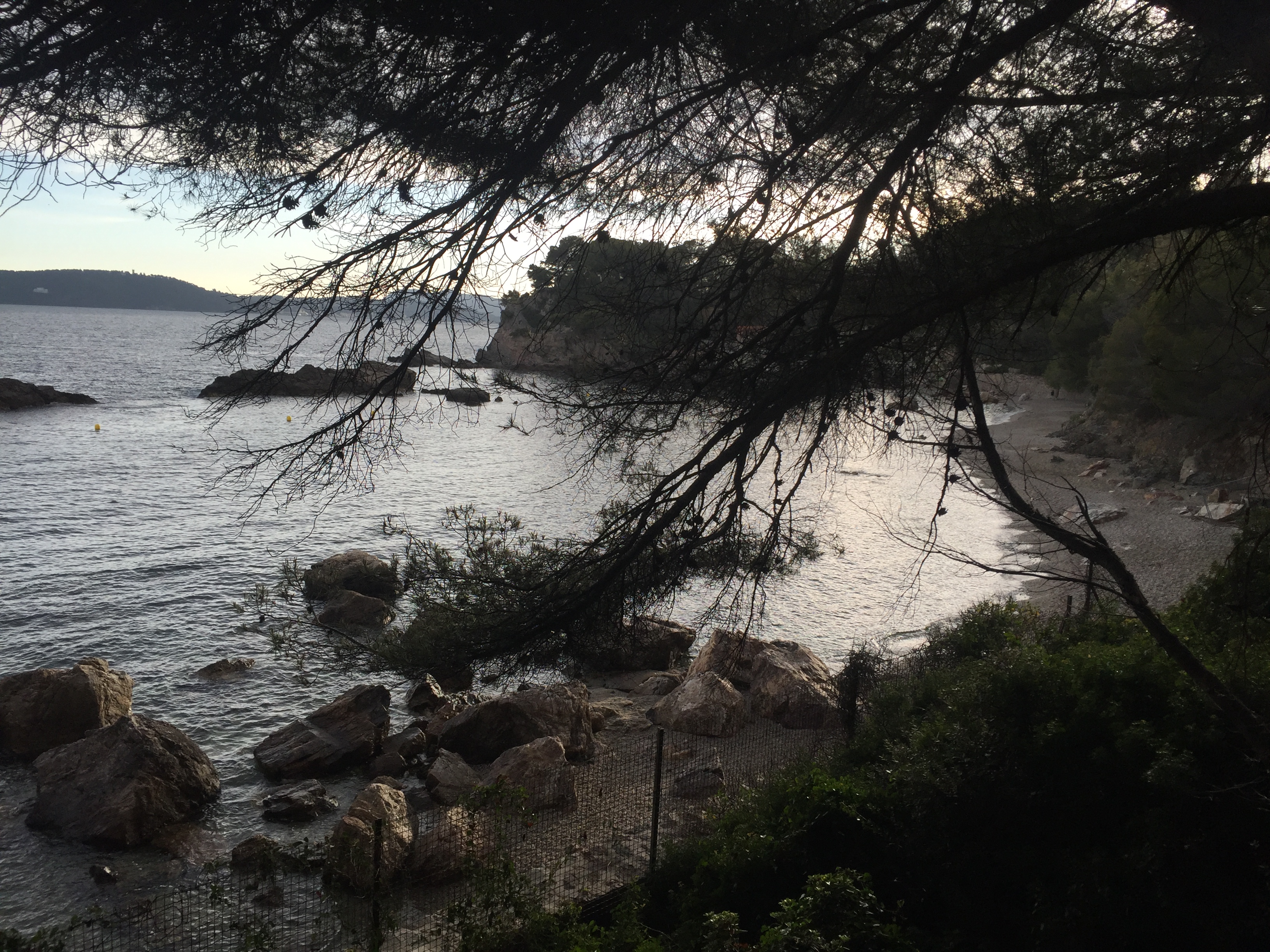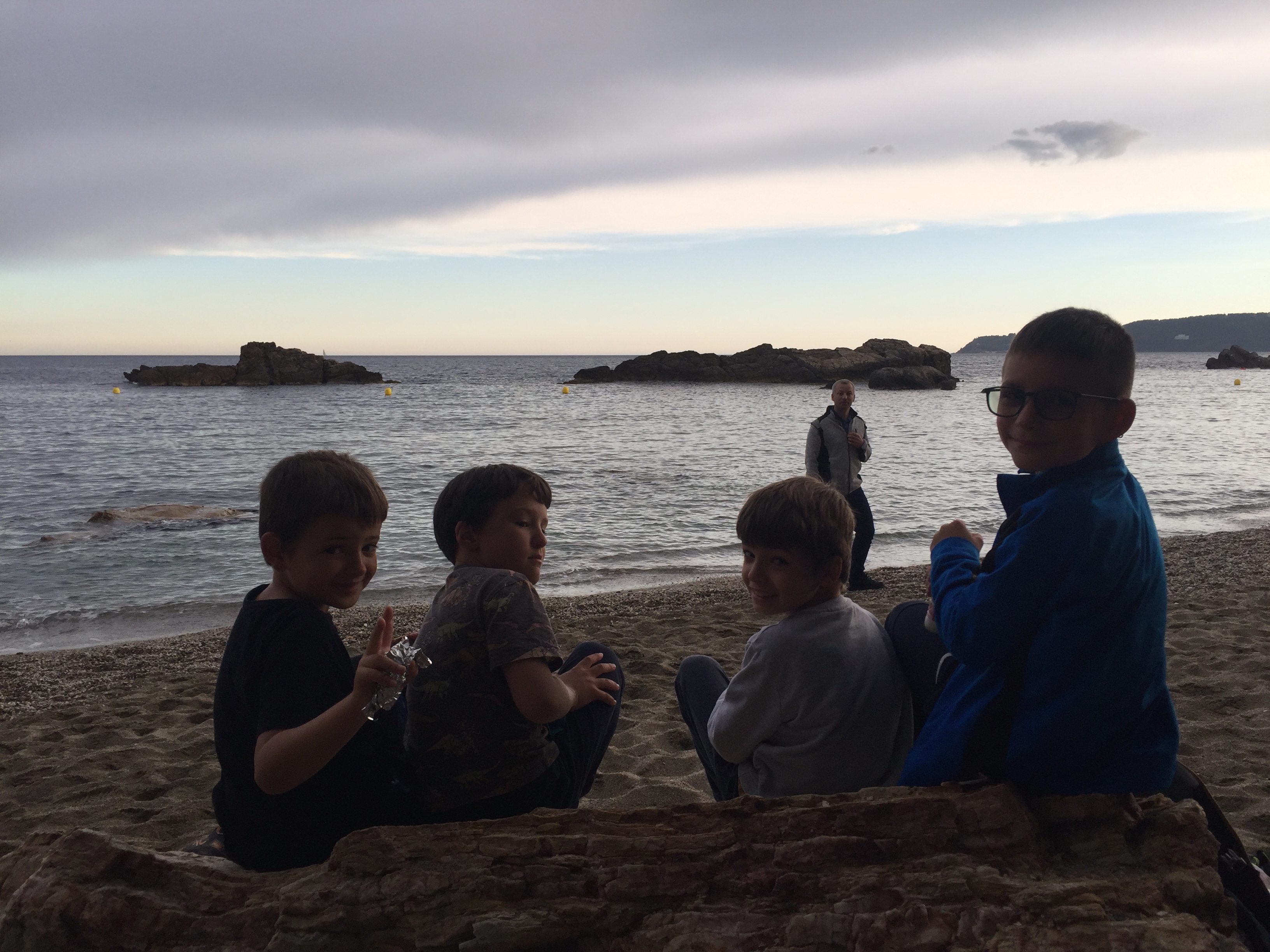 Nous avons ensuite traversé le parc du domaine, où se trouvent un filet de handball, mais surtout un joli petit brin de nature, avant de descendre jusqu'à la plage privée du domaine : « Vous avez trop bien choisi ! » « C'est magnifique ! » « Wouaaah ! » « La mer ! Regardez, il y a un énorme navire ! »