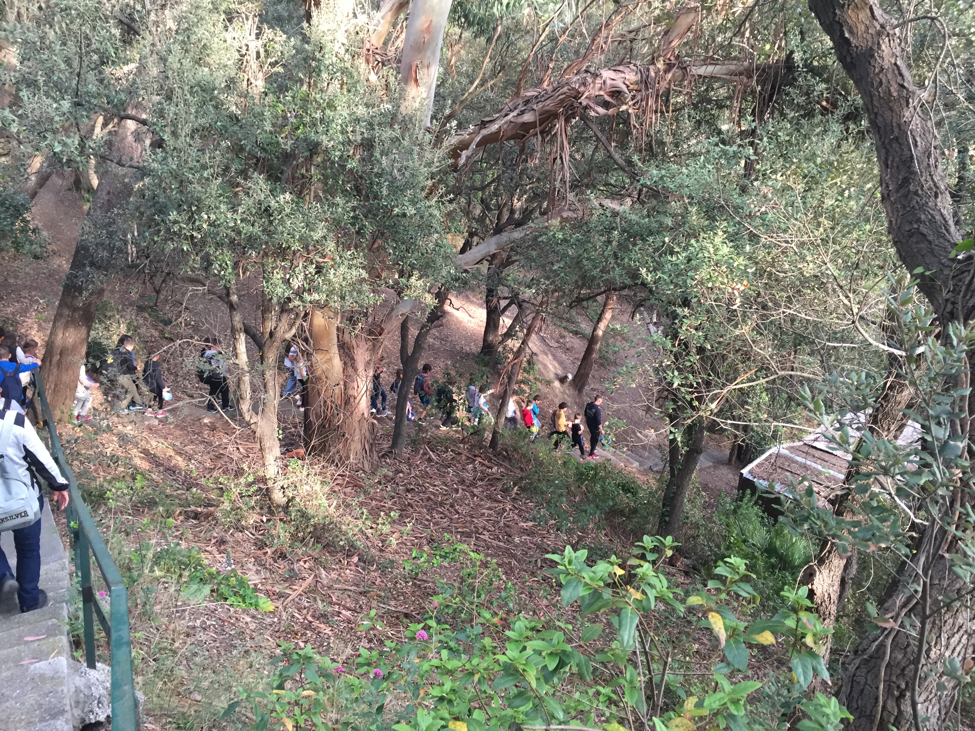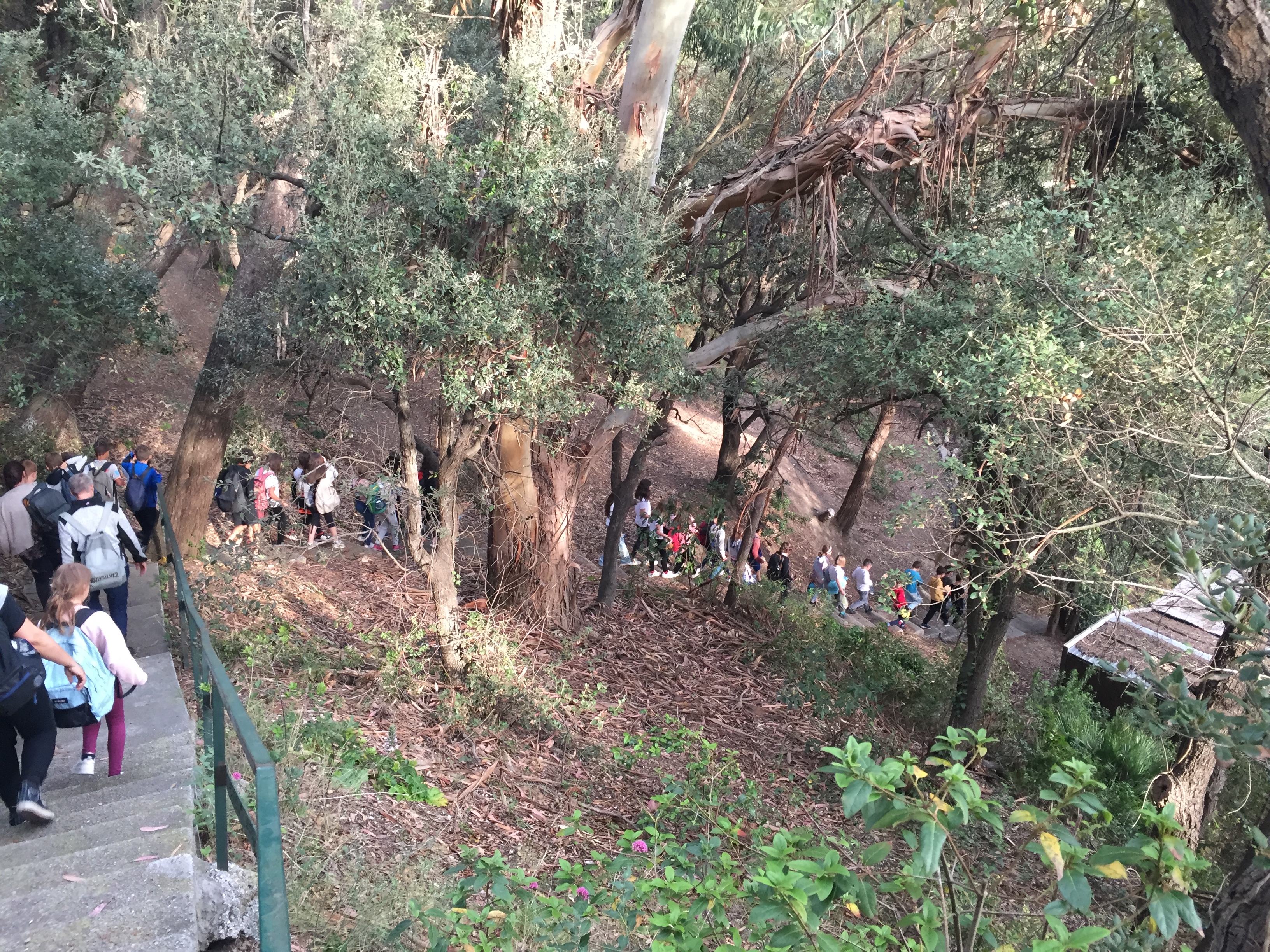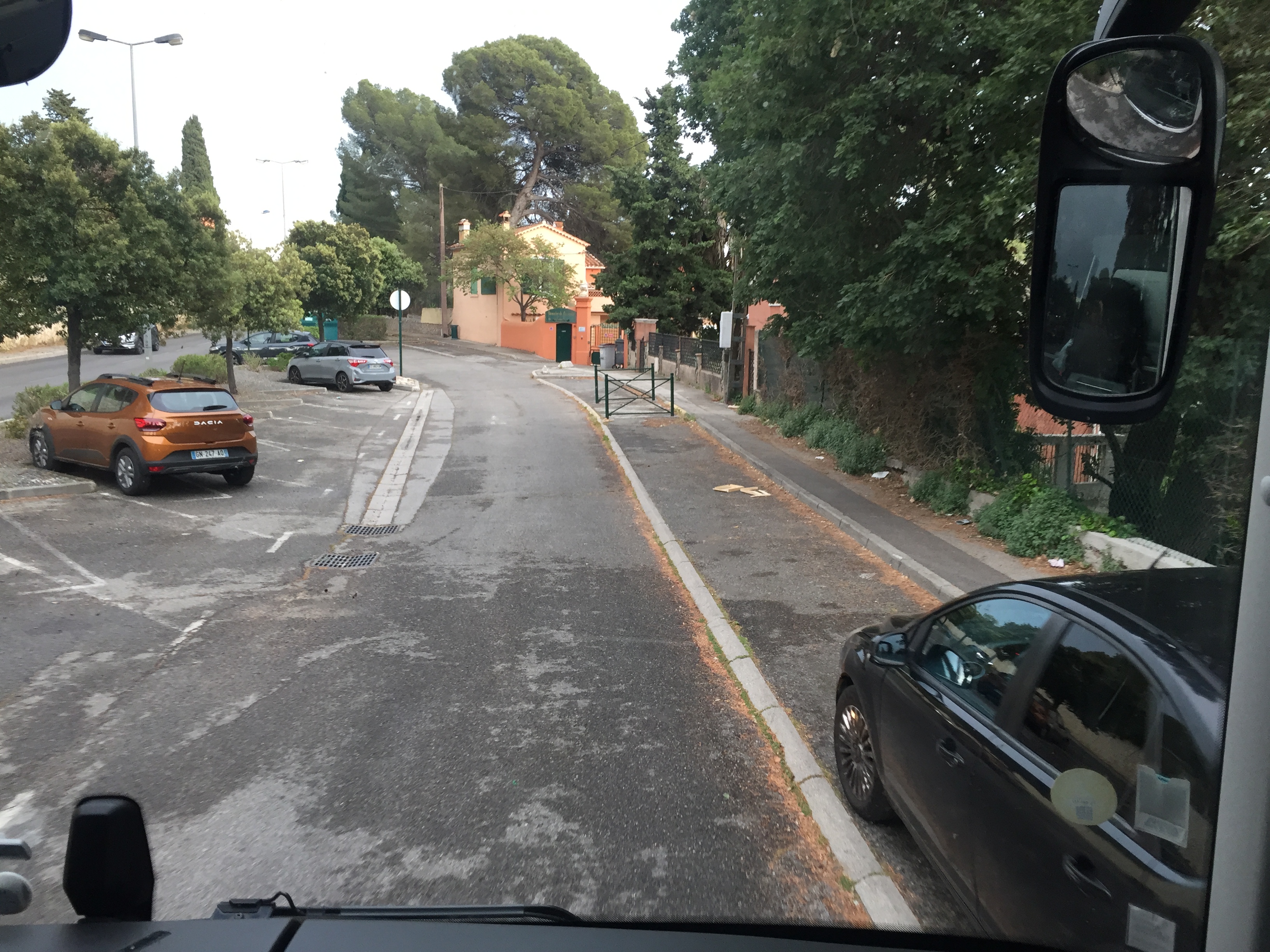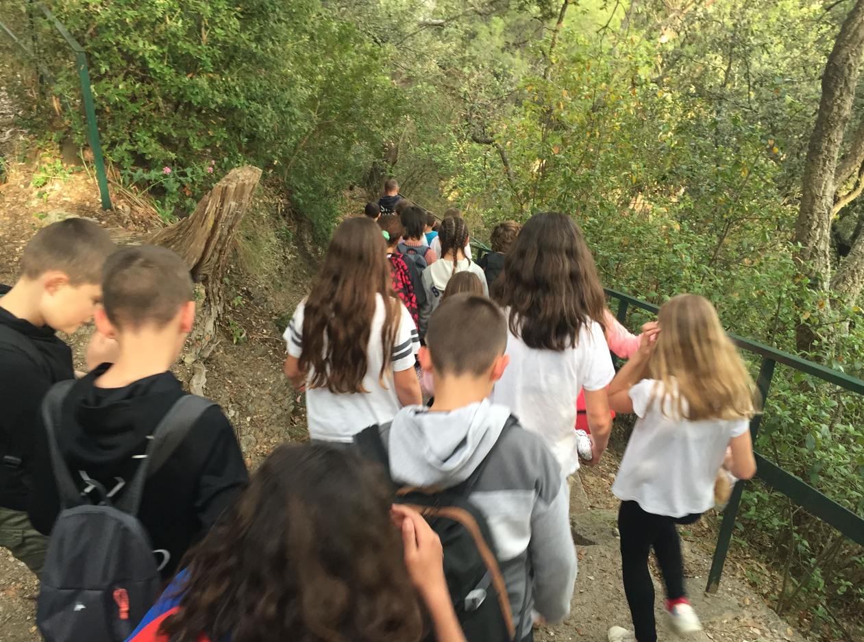 Nous avons ensuite traversé le parc du domaine, où se trouvent un filet de handball, mais surtout un joli petit brin de nature, avant de descendre jusqu'à la plage privée du domaine : « Vous avez trop bien choisi ! » « C'est magnifique ! » « Wouaaah ! » « La mer ! Regardez, il y a un énorme navire ! »