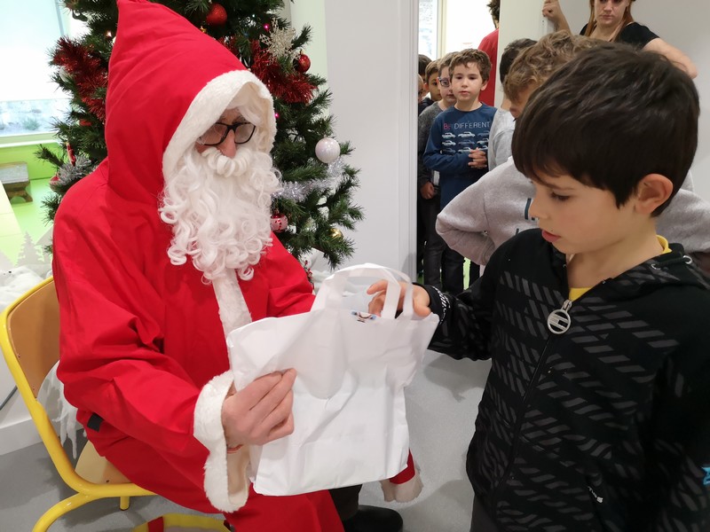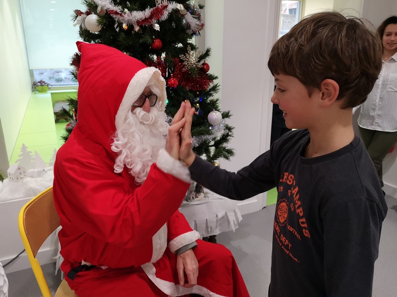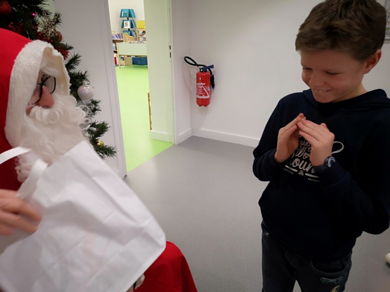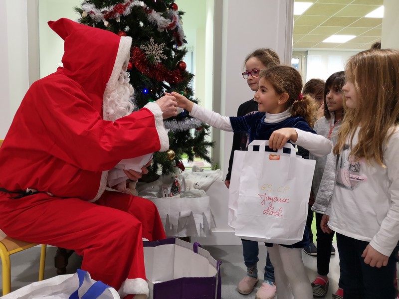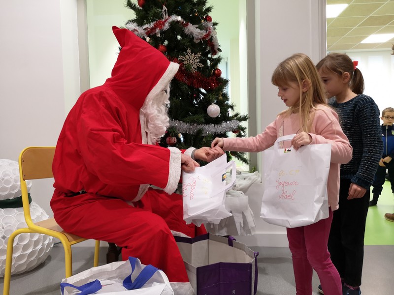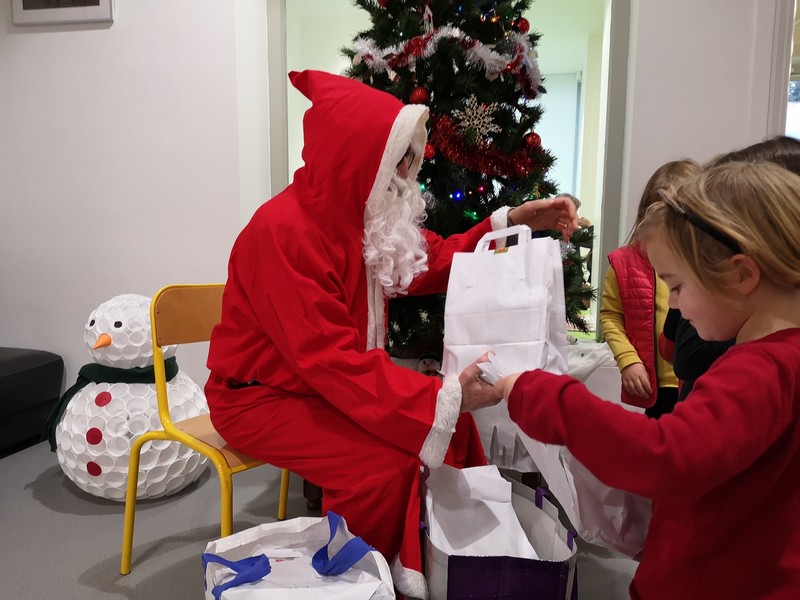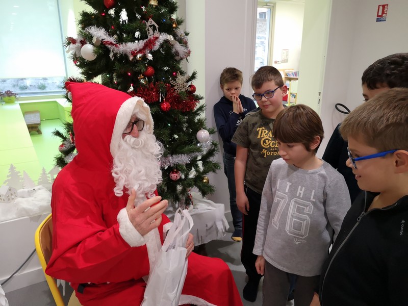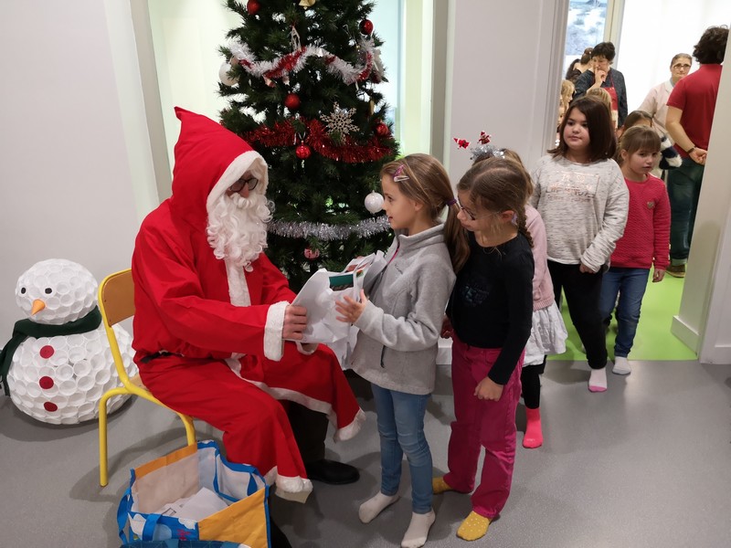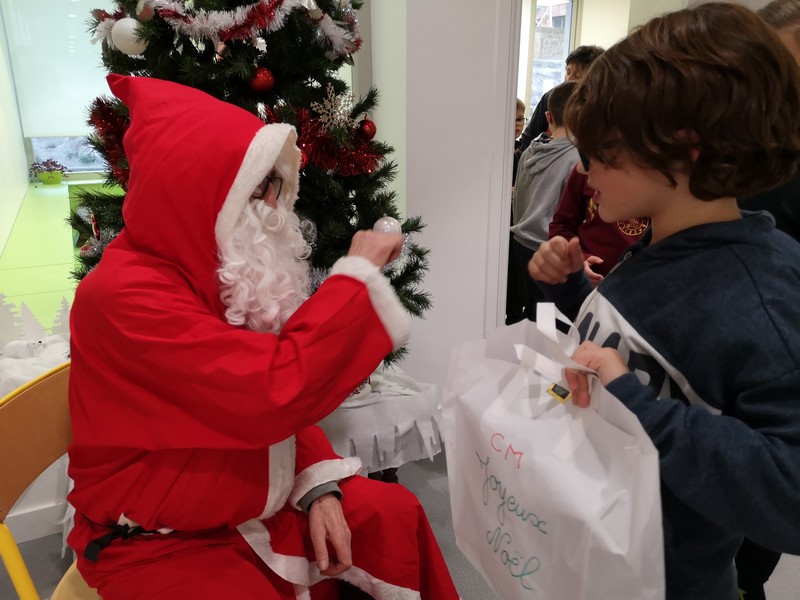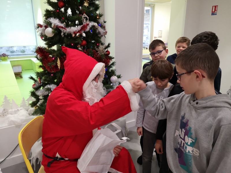 Après le repas tous les élèves ont accueilli le père Noël dans la bibliothèque. Ils lui ont offert ainsi qu'aux cantinières deux chants préparés pour l'occasion.