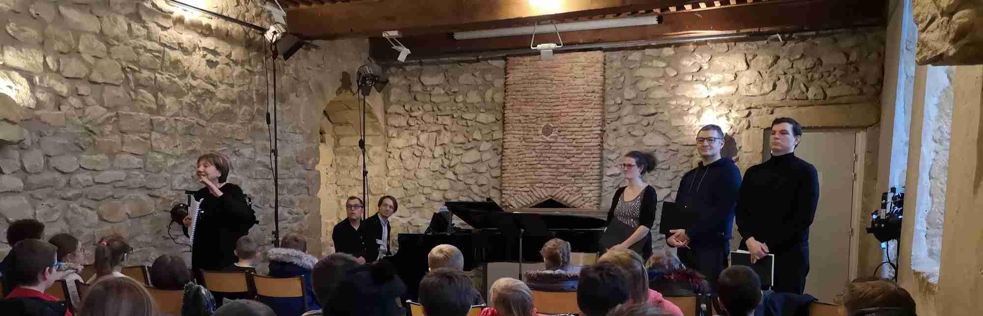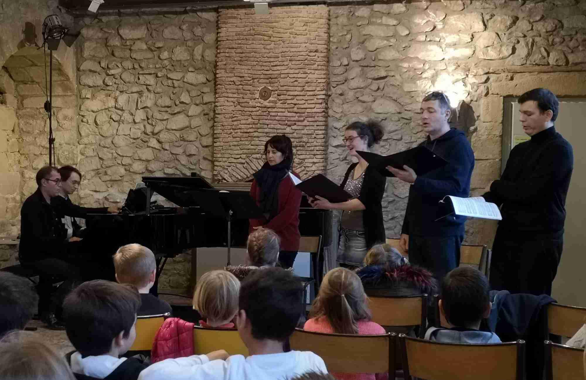 Vendredi 23 novembre, les élèves se sont rassemblés dans la salle d'honneur du château. Ils ont assisté à un moment de répétition du concert qui allait être donné le soir même par un quatuor vocal du choeur Spirito et 2 pianistes jouant à 4 mains sur un seul piano.