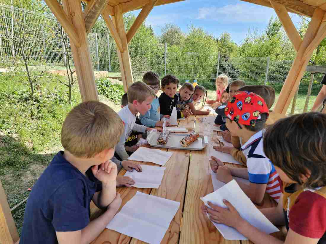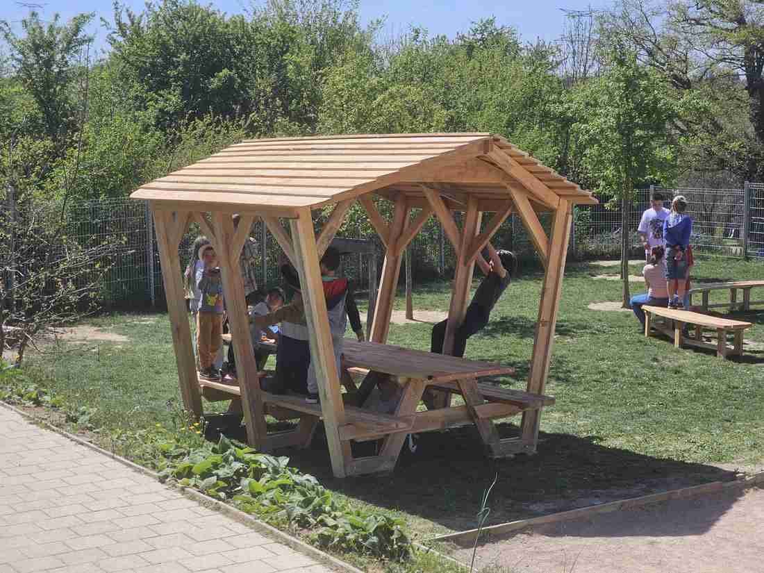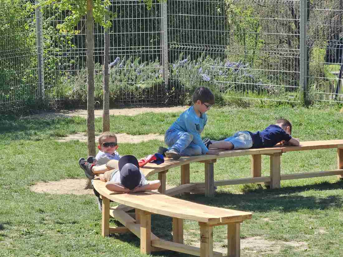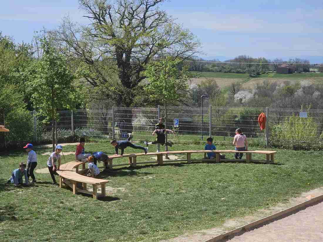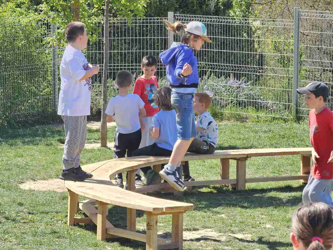 Le Sou des écoles a financé des équipements en bois de douglas pour la cour de l'école et des bancs de rangement sous le préau.